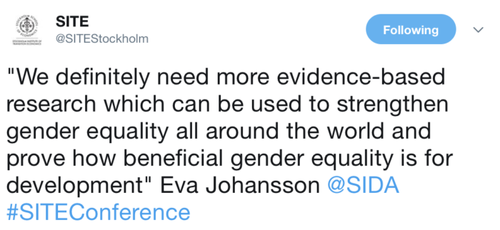 “Abbiamo assolutamente bisogno di più ricerche evidence-based da usare per rafforzare l’uguaglianza di genere nel mondo e dimostrare quanto essa sia vantaggiosa per lo sviluppo” Eva Johansson @SIDA