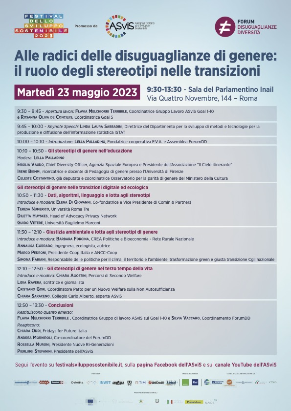 Interverranno: Rosanna Oliva De Conciliis, Coordinatrice Goal 5, Linda Laura Sabbadini, Direttrice del Dipartimento per lo sviluppo di metodi e tecnologie per la produzione e diffusione dell’informazione statistica ISTAT, Lella Palladino, Fondatrice cooperativa E.V.A. e Assemblea ForumDD, Ersilia Vaudo, Chief Diversity Officer, Agenzia Spaziale Europea e Presidente dell’Associazione “Il Cielo itinerante”, Irene Biemmi, ricercatrice e docente di Pedagogia di genere presso l’Università di Firenze, Celeste Costantino, già deputata e coordinatrice Osservatorio per la parità di genere del Ministero della Cultura, Elena Di Giovanni, Co-fondatrice e Vice Presidente di Comin & Partners, Teresa Numerico, Università Roma Tre, Diletta Huyskes, Head of Advocacy Privacy Network, Guido Vetere, Università Guglielmo Marconi, Barbara Forcina, CREA Politiche e Bioeconomia – Rete Rurale Nazionale, Annalisa Corrado, ingegnera, ecologista, autrice, Marco Pedroni, Presidente Coop Italia e ANCC-Coop, Simona Fabiani, Responsabile delle politiche per il clima, il territorio e l’ambiente, trasformazione green e giusta transizione Cgil nazionale, Chiara Agostini, Percorsi di Secondo Welfare, Lidia Ravera, scrittrice e giornalista, Cristiano Gori, Coordinatore Patto per un Nuovo Welfare sulla Non Autosufficienza, Chiara Saraceno, Collegio Carlo Alberto, esperta ASviS, Flavia Terribile, Coordinatrice Gruppo di lavoro ASviS sul Goal 1-10, Silvia Vaccaro, Coordinamento ForumDD, Chiara Oddi, Fridays for Future Italia, Andrea Morniroli, Co-coordinatore del ForumDD, Rossella Muroni, Presidente Nuove Ri-Generazioni, Pierluigi Stefanini, Presidente dell’ASviS.