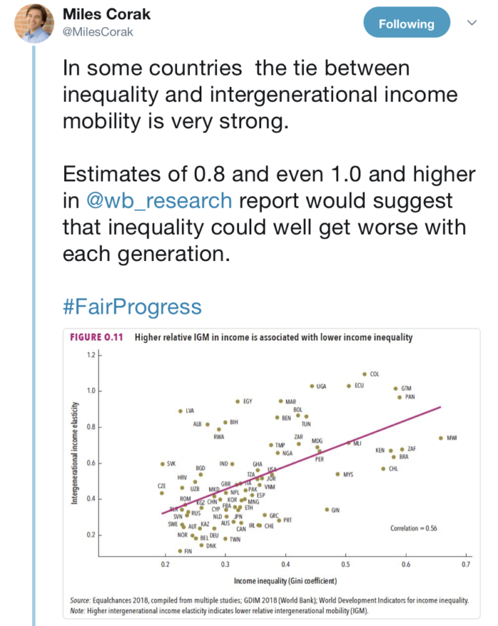 In alcuni paesi il legame tra la disuguaglianza e la mobilità’ intergenerazionale di reddito è molto forte. I risultati di un recente lavoro della Banca Mondiale fanno pensare che la disuguaglianza aumenterà per ognuna delle prossime generazioni.