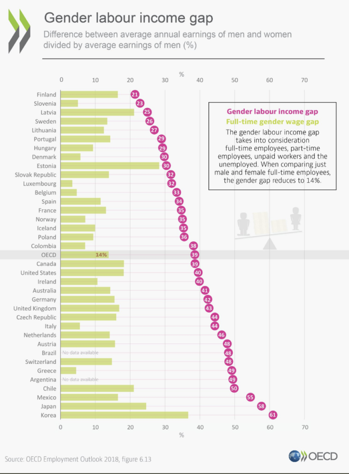 Le donne guadagnano il 39% in meno rispetto agli uomini nei paesi dell’OCSE e il 14% in meno rispetto ai dipendenti a tempo pieno.