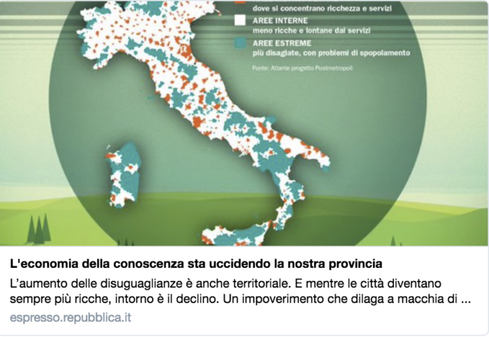 L’economia della conoscenza sta uccidendo i territori. Mentre le città diventano sempre più ricche, intorno c’è il declino e aumentano le diseguaglianze. Un impoverimento che dilaga a macchia di leopardo, dal nord al Mezzogiorno.