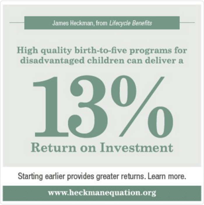 Il tasso di rendimento per gli investimenti nell’istruzione di qualità per la prima infanzia è del 13% l’anno, attraverso risultati migliori in termini di istruzione, salute, produttività, riduzione del crimine e socievolezza.