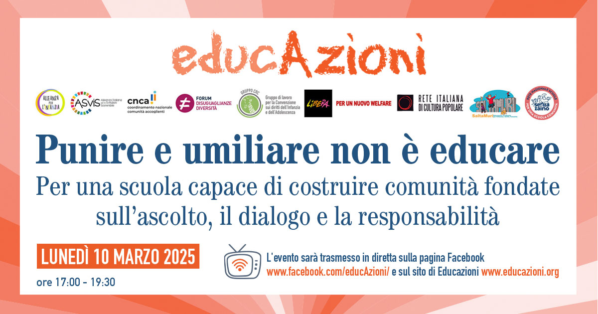 La rete EducAzioni promuove l’incontro online “Punire e umiliare non è educare. Per una scuola capace di costruire comunità fondate sull’ascolto, il dialogo e la responsabilità”, lunedì 10 Marzo 2025 dalle ore 17:00 alle ore 19.30, in diretta streaming sulla pagina Facebook e sul sito della rete EducAzioni