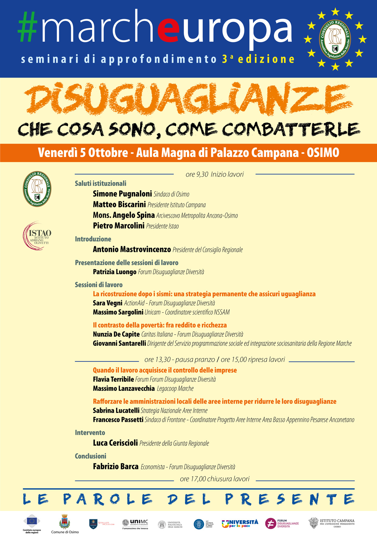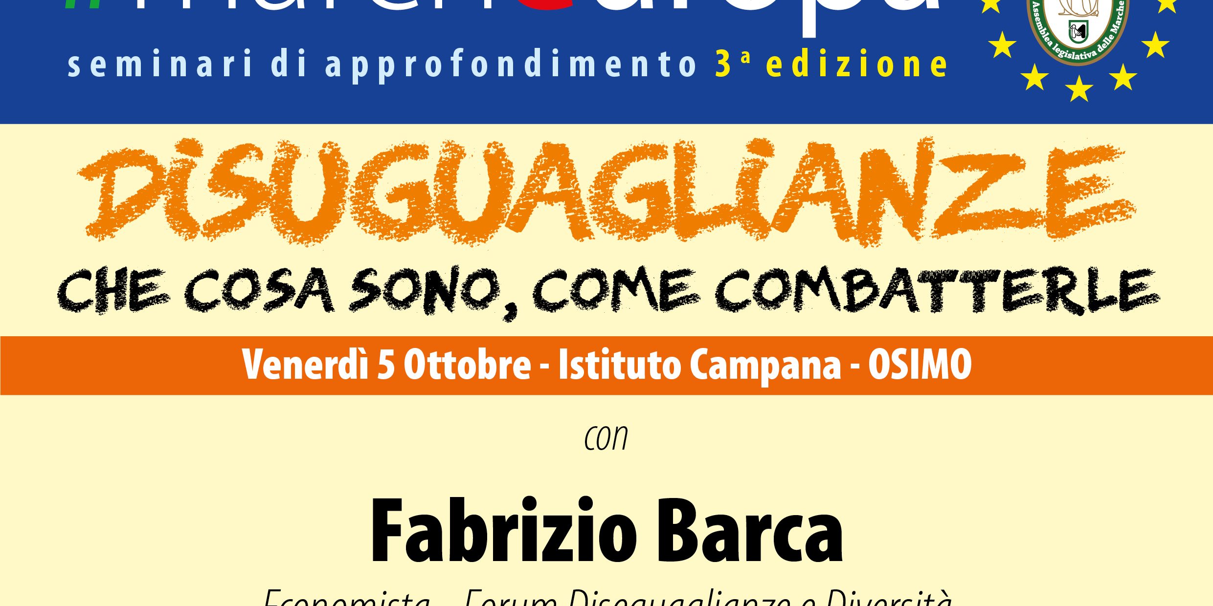 La Presidenza del Consiglio Regionale delle Marche, promuove dei seminari di approfondimento denominati “#marcheuropa” sulle tematiche di maggiore attualità nel rapporto tra territori e Unione europea. La prima giornata, che si terrà il 5 ottobre, sarà dedicata al tema delle disuguaglianze. Interverranno Nunzia De Capite e Flavia Terribile, membri del Comitato Promotore del Forum, e concluderà Fabrizio Barca, già Ministro della Coesione Territoriale e membro del Comitato Promotore.
