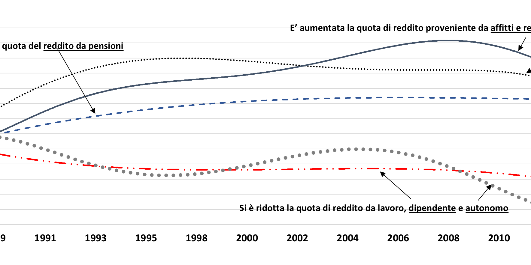 Il grafico presenta il cambiamento relativo del peso delle componenti del reddito disponibile delle famiglie italiane tra la fine degli anni ’80 e il 2014, utilizzando il 1987 come anno base. Rispetto alla fine degli anni ’80 è aumentata la quota di reddito da pensioni e sono cresciute le quote di reddito provenienti da affitti e rendite e da capitale mentre si è ridotto il peso del lavoro: i redditi da lavoro, sia dipendente che autonomo, sono scesi a valori inferiori a quelli del 1987.