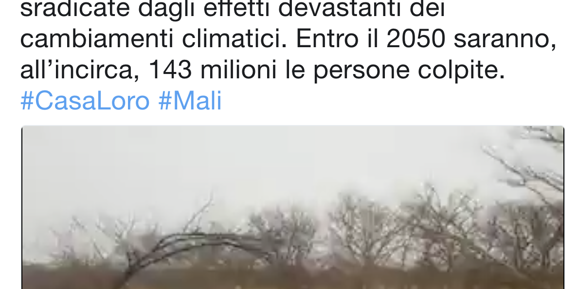 Lug22018Una goccia al giorno Soumaila Sacko era una delle 26 milioni di persone che mediamente ogni anno vengono sradicate dagli effetti devastanti dei cambiamenti climatici. Entro il 2050 saranno, all’incirca, 143 milioni le persone colpite. #CasaLoro #Mali Aboubakar Soumahoro – Attivista sindacale e sociale LEGGI L’ORIGINALE IL PENSIERO DEL FORUM Condividi questo post Share on FacebookShare on Facebook Share on XShare on X Share on WhatsAppShare on WhatsApp Articoli correlatiGOCCIA- La povertà ha molte dimensioni oltre a quella monetaria11 Marzo, 2019GOCCIA- La crisi economica più grave che stiamo affrontando riguarda il mostruoso livello di disuguaglianza10 Marzo, 2019GOCCIA- Le nuove tecnologie offrono molteplici opportunità, ma se non saranno regolate prevarrà il “lato oscuro”9 Marzo, 2019GOCCIA- Dovremmo sviluppare innovazioni che promuovono l’inclusione sociale e possono salvare il pianeta7 Marzo, 2019GOCCIA- Potrebbe aumentare la disuguaglianza all’interno dei paesi e diminuire quella tra paesi6 Marzo, 2019GOCCIA- Tra tutte le nazioni ricche, gli Stati Uniti sono quelli con la maggiore disuguaglianza di ricchezza5 Marzo, 2019