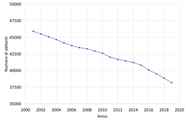 Figura 1: Profilo demografico relativo a dodici comuni delle Madonie nel periodo 2001-2019. (Fonte ISTAT)
