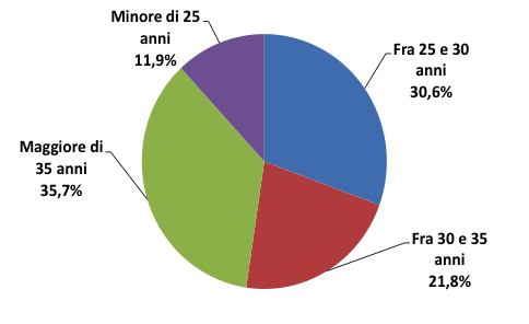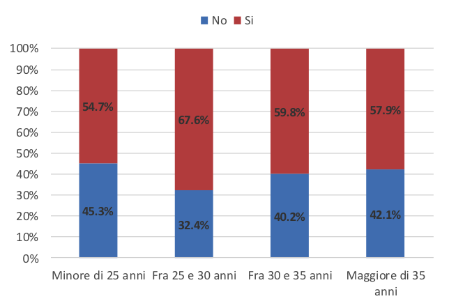 Un dato interessante riguarda le fasce di età di chi sarebbe più incline a tornare sotto condizioni ideali (Figura 5): le due fasce estreme (minore di 25 anni e maggiore di 35 anni) sono le meno inclini a tornare mentre le più inclini sono le fasce intermedie con prevalenza della fascia di età compresa fra 25 e 30 anni (67.6% SI – 32.4% NO).