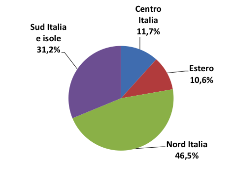 La fascia dei partecipanti con età compresa fra 25 e 30 anni e quella con età maggiore di 35 anni (Figura 2) sono le due fasce anagrafiche più presenti nel campione statistico. E’ interessante notare la distribuzione geografica degli intervistati (Figura 3) in cui, come prevedibile, il Nord Italia prevale, ma il 31.2% dichiara di risiedere nel Sud Italia-Isole. Ciò mostra come le aree interne del meridione non soffrano solo l’emorragia demografica verso il Settentrione ma, presumibilmente, anche verso le aree metropolitane meridionali densamente popolate della fascia costiera.