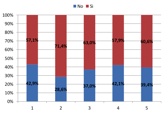 Figura 7: Idealmente, a parità di condizioni lavorative o di studio, saresti disposto/a a tornare sulle Madonie?”. Categorizzazione per fasce di indipendenza economica (1 non indipendente – 5 totalmente indipendente)