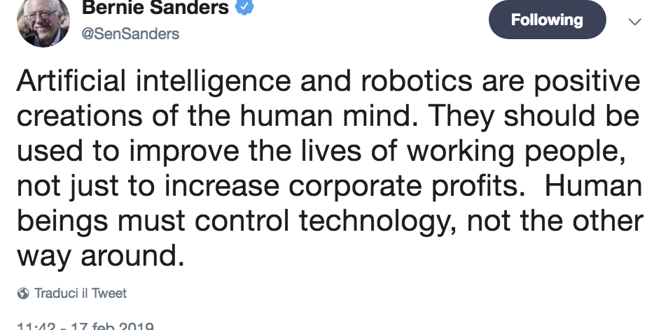 L’intelligenza artificiale e la robotica sono creazioni positive della mente umana. Dovrebbero essere usate per migliorare la vita dei lavoratori, non solo per aumentare i profitti delle imprese. Gli esseri umani devono controllare la tecnologia, non il contrario.