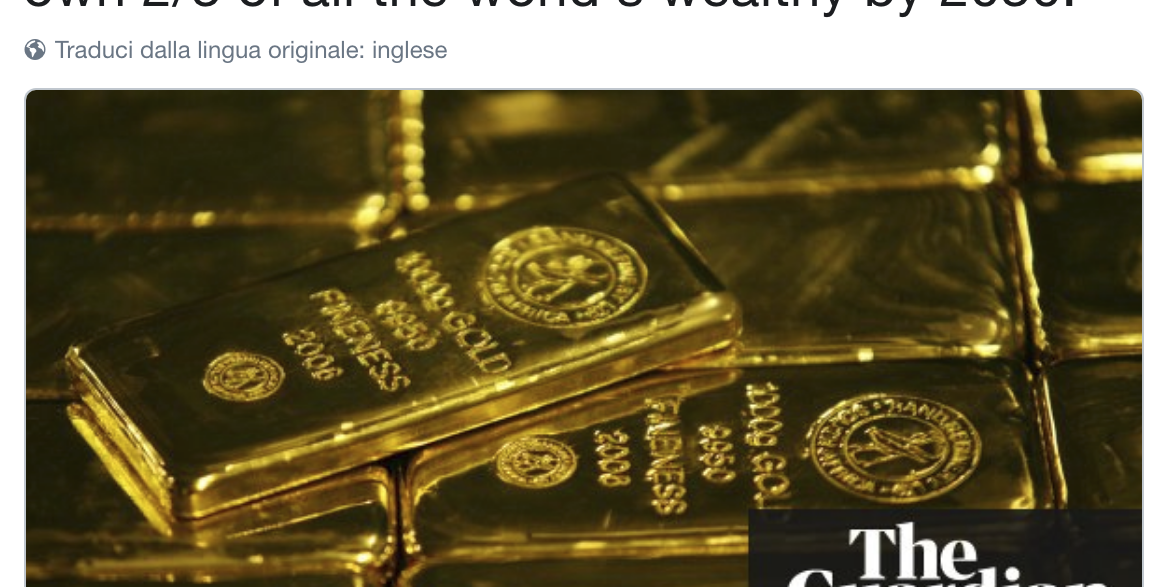 Apr162018Una goccia al giorno E’ insostenibile: l’1% più ricco possiederà 2/3 della ricchezza mondiale entro il 2030. Robert Reich – Berkeley prof, former Sec. of Labor. Co-Founder @InequalityMedia LEGGI L’ORIGINALE PER APPROFONDIRE IL PENSIERO DEL FORUM Condividi questo post Share on FacebookShare on Facebook Share on XShare on X Share on WhatsAppShare on WhatsApp Articoli correlatiGOCCIA- La povertà ha molte dimensioni oltre a quella monetaria11 Marzo, 2019GOCCIA- La crisi economica più grave che stiamo affrontando riguarda il mostruoso livello di disuguaglianza10 Marzo, 2019GOCCIA- Le nuove tecnologie offrono molteplici opportunità, ma se non saranno regolate prevarrà il “lato oscuro”9 Marzo, 2019GOCCIA- Dovremmo sviluppare innovazioni che promuovono l’inclusione sociale e possono salvare il pianeta7 Marzo, 2019GOCCIA- Potrebbe aumentare la disuguaglianza all’interno dei paesi e diminuire quella tra paesi6 Marzo, 2019GOCCIA- Tra tutte le nazioni ricche, gli Stati Uniti sono quelli con la maggiore disuguaglianza di ricchezza5 Marzo, 2019