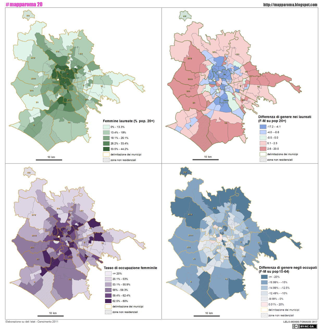 A Roma le donne costituiscono più della metà dei laureati e costituiscono la maggioranza in 85 zone urbanistiche della città mentre in altre 69 la maggior parte dei laureati sono uomini; esiste dunque una forte caratterizzazione territoriale (cfr. quadrante in alto a destra) con la maggior parte delle zone a prevalenza di laureate donne localizzate fuori dal GRA.