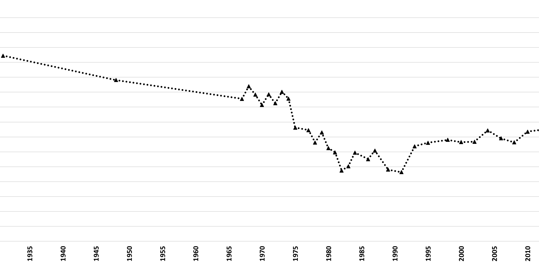 Il grafico presenta il trend della disuguaglianza di reddito misurata attraverso l’indice di Gini. La disuguaglianza, in calo fino agli anni ’70, ha ricominciato a crescere a partire dalla fine degli anni ’70 e questo aumento ha coinciso con l’inversione delle politiche pubbliche e il cambiamento del senso comune.