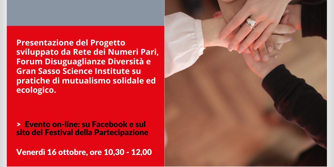Il 16 ottobre alle 10:30, nell’ambito del Festival della Partecipazione, si terrà la presentazione del progetto sviluppato da Rete dei Numeri Pari, Forum Disuguaglianze Diversità e Gran Sasso Science Institute sulle pratiche di mutualismo solidale ed ecologico
