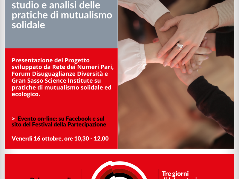 Un rapporto innovativo e originale che ha coinvolto 91 realtà tra quelle appartenenti alla Rete dei Numeri Pari tra il 2020 e il 2022. Abbiamo scoperto che nel 94,5% dei casi svolte viene attribuito un ruolo prioritario alla realizzazione di percorsi di partecipazione e confronto, sia all’interno delle realtà stesse, sia con altre realtà, sia nella ricercata interazione con il soggetto pubblico: il 91,2% del campione si relaziona con le istituzioni, ma il 33% reputa tale interazione insoddisfacente. Un rapporto che ha indagato come i vuoti causati dalle crisi economiche e dalla mancanza di risposte politiche adeguate e misure efficaci siano state riempite da pratiche di coesione sociale e territoriali con al centro i bisogni, i desideri e il protagonismo di persone e comunità, e di rappresentare n argine all’esclusione sociale e alla criminalità organizzata. L’indagine “La pienezza del vuoto, studio e analisi delle pratiche di mutualismo solidale della Rete dei Numeri Pari”, è stato sviluppata dalla Rete dei Numeri Pari, dal Forum Disuguaglianze e Diversità e dal Gran Sasso Science Institute, per rafforzare la consapevolezza, la qualità e la robustezza delle esperienze di mutualismo in corso, che fanno parte della Rete dei Numeri Pari, e diffondere le pratiche come strumento di coesione sociale e territoriale in altre aree.