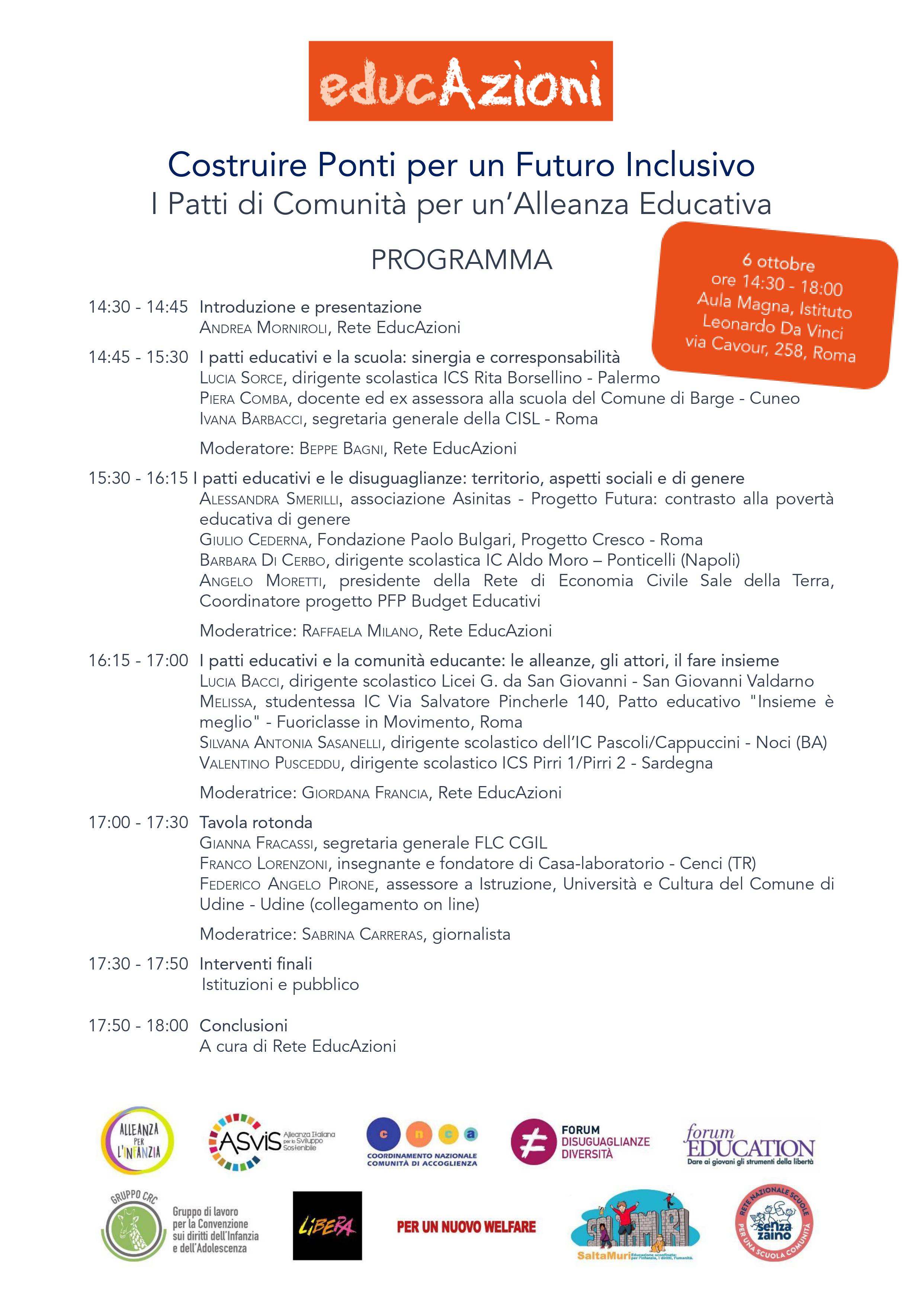 L’evento “Costruire Ponti per un Futuro Inclusivo. I Patti di Comunità per un’Alleanza Educativa”, organizzato dalla Rete EducAzioni, il prossimo 6 ottobre dalle 14:30 alle 18:00 presso l’Istituto di istruzione Leonardo Da Vinci di Roma, vuole agevolare il confronto e il dialogo circa lo strumento dei Patti Educativi, fondamentali presidi civici e culturali di contrasto alla povertà educativa e alla dispersione scolastica in diversi territori, oltre che chiave importante per il successo formativo e la costruzione dell’autonomia personale dei bambini e delle bambine, a garanzia di un percorso di istruzione di qualità. L’obiettivo della Rete EducAzioni è contribuire a mettere a sistema ciò che finora è stato sperimentato nei limiti di esperienze isolate e talvolta precarie, passando da una dimensione progettuale ‘a tempo determinato’ (come quella dei bandi) a uno strumento di policy ordinario e strutturale.