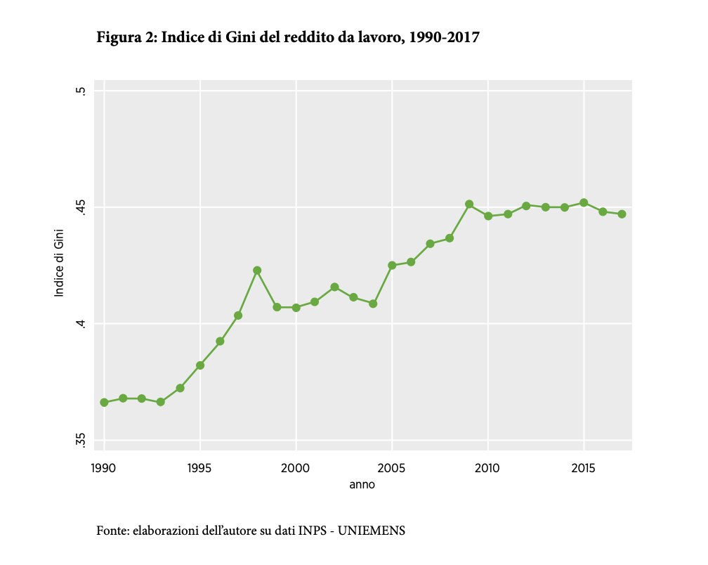L’Italia, infatti, è l’unico dei paesi OCSE in cui c’è stata una riduzione del salario medio tra il 1990 e il 2020 (circa 3 punti percentuali) e nello stesso periodo sono aumentate anche le disuguaglianze salariali, in particolare tra gli anni ’90 e la seconda metà della prima decade degli anni 2000. Come si può vedere dal grafico nel periodo tra il 1990 ed il 2017 l’indice di Gini del reddito da lavoro è passato da 36.6 punti nel 1990 al valore di 44.7 nel 2017.