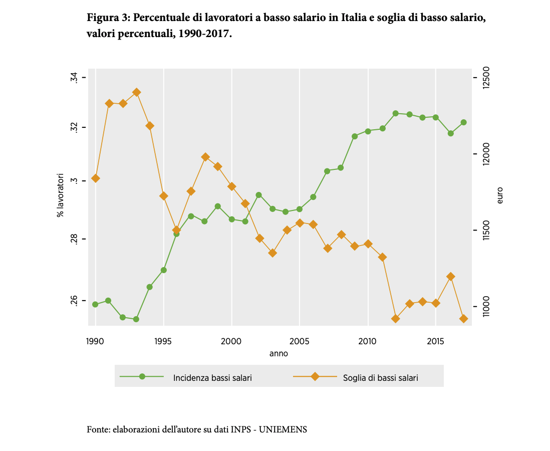 Come mostrato dalla Figura 3, nel periodo 1990-2017 la soglia relativa alla retribuzione bassa in Italia è diminuita (circa l’8% in meno) raggiungendo i 10,919 euro annui a partire da 11,673 euro annui, e al tempo stesso l’incidenza dei bassi salari è aumentata da 25.9 punti percentuali nel 1990 a 32.2 punti percentuali nel 2017 sul totale dei lavoratori italiani.