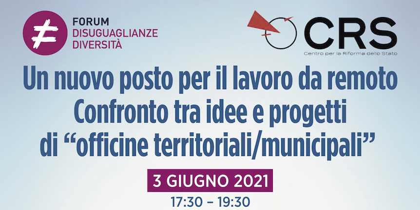 Il 3 giugno alle 17:30 Forum Disuguaglianze e Diversità e Centro per la Riforma dello Stato organizzano il convegno online “Un nuovo posto per il lavoro da remoto” con l’obiettivo di raccontare, nella loro diversità, alcune delle iniziative locali che si stanno progettando e avviare il confronto con i decisori pubblici sulle possibilità di sostegno e le opportunità di generalizzazione di queste esperienze. La proposta ha infatti suscitato interesse in diversi contesti territoriali, ciascuno dei quali l’ha rielaborata in base alle proprie caratteristiche e condizioni di partenza.