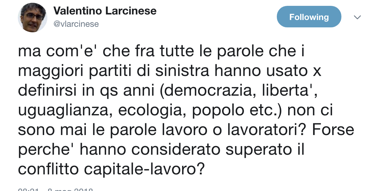 Perchè la sinistra non usa più la parola lavoro e lavoratori? Hanno forse considerato superato il conflitto capitale-lavoro?