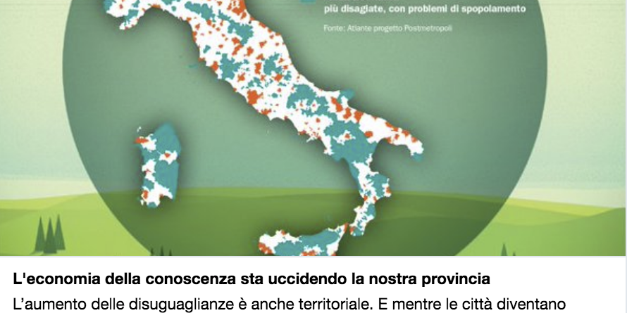 Set112018Una goccia al giorno L’economia della conoscenza sta uccidendo i territori. Mentre le città diventano sempre più ricche, intorno c’è il declino e aumentano le diseguaglianze. Un impoverimento che dilaga a macchia di leopardo, dal nord al Mezzogiorno. Eur&ca – Aiutiamo #Comuni #PMI #nonprofit#startup a cogliere i #fondiUE LEGGI L’ORIGINALE PER APPROFONDIRE IL PENSIERO DEL FORUM Condividi questo post Share on FacebookShare on Facebook Share on XShare on X Share on WhatsAppShare on WhatsApp Articoli correlatiGOCCIA- La povertà ha molte dimensioni oltre a quella monetaria11 Marzo, 2019GOCCIA- La crisi economica più grave che stiamo affrontando riguarda il mostruoso livello di disuguaglianza10 Marzo, 2019GOCCIA- Le nuove tecnologie offrono molteplici opportunità, ma se non saranno regolate prevarrà il “lato oscuro”9 Marzo, 2019GOCCIA- Dovremmo sviluppare innovazioni che promuovono l’inclusione sociale e possono salvare il pianeta7 Marzo, 2019GOCCIA- Potrebbe aumentare la disuguaglianza all’interno dei paesi e diminuire quella tra paesi6 Marzo, 2019GOCCIA- Tra tutte le nazioni ricche, gli Stati Uniti sono quelli con la maggiore disuguaglianza di ricchezza5 Marzo, 2019