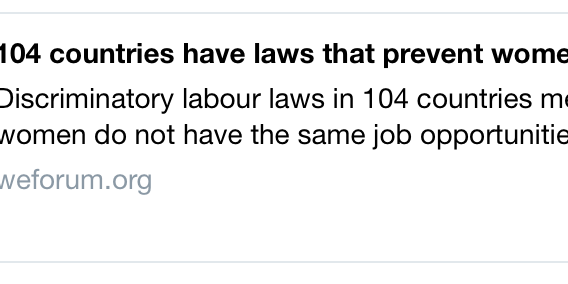 Set12018Una goccia al giorno 104 paesi hanno leggi che impediscono alle donne di svolgere alcuni lavori World Bank Poverty LEGGI L’ORIGINALE IL PENSIERO DEL FORUM Condividi questo post Share on FacebookShare on Facebook Share on XShare on X Share on WhatsAppShare on WhatsApp Articoli correlatiGOCCIA- La povertà ha molte dimensioni oltre a quella monetaria11 Marzo, 2019GOCCIA- La crisi economica più grave che stiamo affrontando riguarda il mostruoso livello di disuguaglianza10 Marzo, 2019GOCCIA- Le nuove tecnologie offrono molteplici opportunità, ma se non saranno regolate prevarrà il “lato oscuro”9 Marzo, 2019GOCCIA- Dovremmo sviluppare innovazioni che promuovono l’inclusione sociale e possono salvare il pianeta7 Marzo, 2019GOCCIA- Potrebbe aumentare la disuguaglianza all’interno dei paesi e diminuire quella tra paesi6 Marzo, 2019GOCCIA- Tra tutte le nazioni ricche, gli Stati Uniti sono quelli con la maggiore disuguaglianza di ricchezza5 Marzo, 2019