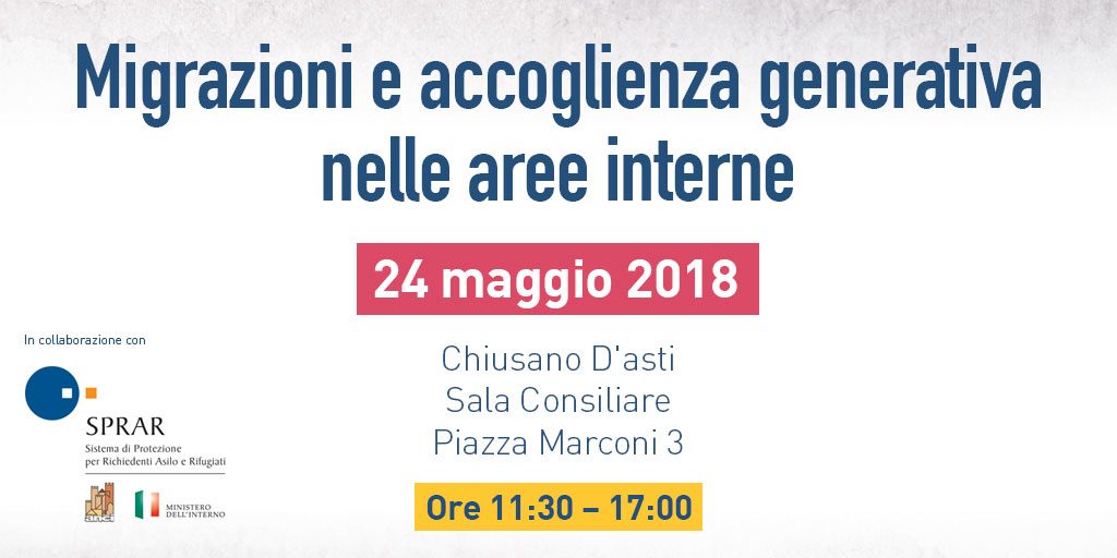 Il 24 maggio 2018, presso la Sala Consiliare del Comune di Chiusano D’Asti, si terrà il Workshop “Migrazioni e accoglienza generativa nelle aree interne”, organizzato dal Forum Disuguaglianze Diversità e dalla Strategia Nazionale Aree Interne, nell’ambito del Festival dello Sviluppo Sostenibile.