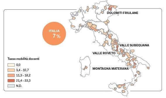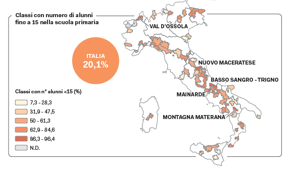 La presenza di pluriclassi nei comuni aree interne ha un valore medio pari al 3,8% (vs 1,2% valore medio nazionale), con una elevata variabilità nelle 72 aree progetto della Strategia Nazionale per le Aree Interne. Si va dal 60% di pluriclassi in Grand-Paradis (Valle d’Aosta), fino al 50% in Valle Ossola (Piemonte), al 40% in Valle Subequana (Abruzzo) e in Alta Carnia (Friuli-Venezia Giulia), al 37,5% in Alta Valle Arroscia (Liguria) e al 34,1% in Valle Bormida (Piemonte).