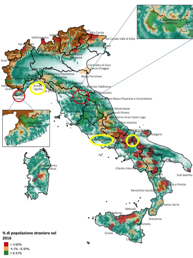 Nell’area Casentino-Valtiberina (9 comuni in provincia di Arezzo, con una popolazione pari a 21.341 abitanti), nonostante la presenza di stranieri sia in leggera diminuzione, a partire dagli anni novanta si sono radicate diverse comunità: i lavoratori impegnati nel taglio del bosco, le badanti, piccole comunità di indiani. L’area Alta Valle Arroscia raggruppa 11 comuni con un totale di 4.498 abitanti distribuiti su oltre 40 frazioni (tra le aree progetto, è la terza area meno popolosa ma anche la seconda più piccola come superficie – 254 Kmq). La presenza di stranieri è legata alla valenza turistica dell’area: alcuni turisti giunti in valle oggi vi risiedono e hanno avviato attività imprenditoriali (cfr. Preliminare di Strategia). Inoltre, è significativa la presenza di stranieri/migranti. Nel comune di Pornassio, formato da cinque frazioni che contano circa 700 abitanti, sono stati registrati 173 richiedenti asilo, rendendolo uno dei piccoli centri a più alta densità di stranieri sul territorio italiano (cfr. la stampa). Si tratta di una tendenza che, in prospettiva, va letta in termini di opportunità, apertura di comunità e mantenimento di segmenti di economia locale e di welfare.
