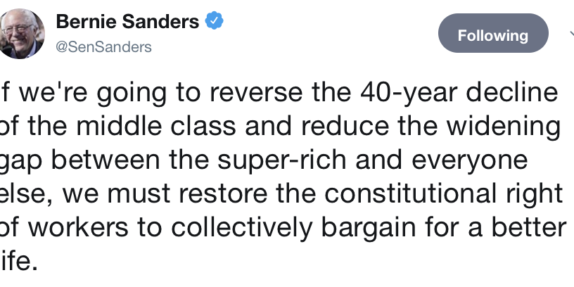 Se vogliamo interrompere il declino della classe media osservato negli ultimi 40 anni, invertendo questa tendenza, e ridurre il gap tra i super-ricchi e il resto della popolazione, dobbiamo ripristinare il diritto costituzionale dei lavoratori di negoziare collettivamente per una vita migliore.
