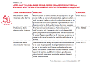 La prevenzione e il contrasto alla violenza su donne e ragazze occupa particolare rilievo nella Roadmap, con impegni che si articolano su tre assi: prevenzione, protezione e punizione.