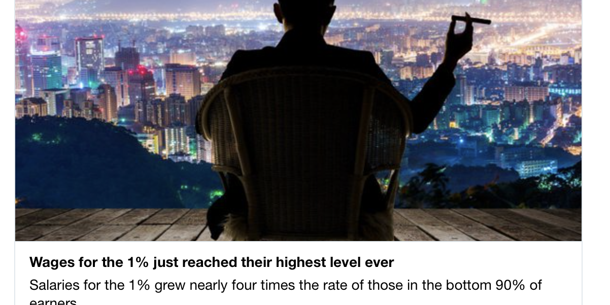 Nov42018Una goccia al giorno I salari del top-1% sono aumentati quasi quattro volte quello dei lavoratori che si trovano nel bottom-90% Economic Policy Institute – Research and Ideas for Shared Prosperity LEGGI L’ORIGINALE PER APPROFONDIRE IL PENSIERO DEL FORUM Condividi questo post Share on FacebookShare on Facebook Share on XShare on X Share on WhatsAppShare on WhatsApp Articoli correlatiGOCCIA- La povertà ha molte dimensioni oltre a quella monetaria11 Marzo, 2019GOCCIA- La crisi economica più grave che stiamo affrontando riguarda il mostruoso livello di disuguaglianza10 Marzo, 2019GOCCIA- Le nuove tecnologie offrono molteplici opportunità, ma se non saranno regolate prevarrà il “lato oscuro”9 Marzo, 2019GOCCIA- Dovremmo sviluppare innovazioni che promuovono l’inclusione sociale e possono salvare il pianeta7 Marzo, 2019GOCCIA- Potrebbe aumentare la disuguaglianza all’interno dei paesi e diminuire quella tra paesi6 Marzo, 2019GOCCIA- Tra tutte le nazioni ricche, gli Stati Uniti sono quelli con la maggiore disuguaglianza di ricchezza5 Marzo, 2019