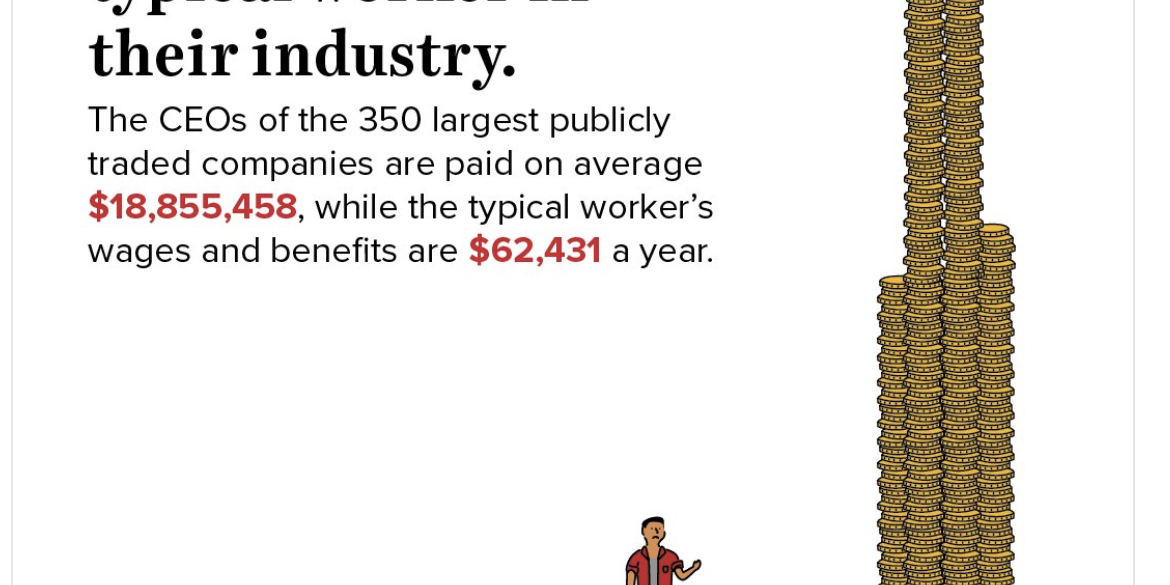 Nel 2017, gli amministratori delegati delle 350 imprese più grandi degli Stati Uniti hanno ricevuto in media un compenso pari a 18,9$ milioni di dollari, un aumento del 17,6% rispetto al 2016. Il compenso di un lavoratore comune è rimasto invariato, essendo aumentato solo dello 0,3%.