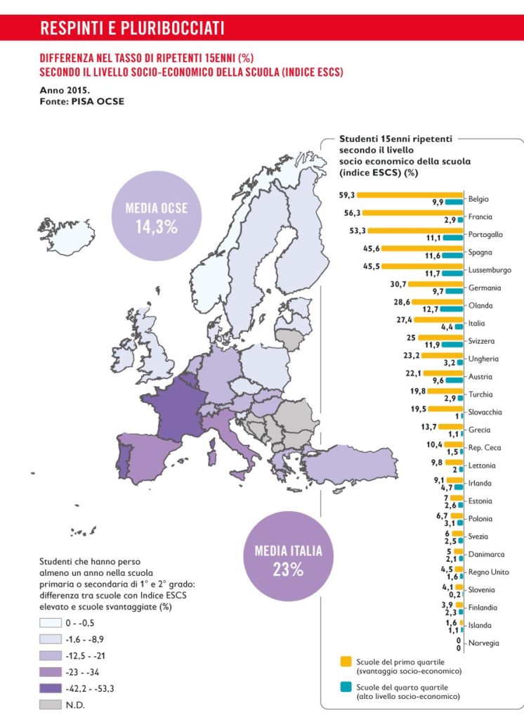 PISA 2015 permette inoltre di realizzare tutta una serie di elaborazioni sulla tipologia prevalente degli alunni chiamati a ripetere l’anno e mostra inequivocabilmente la correlazione tra condizioni di svantaggio sociale e maggiore incidenza delle ripetenze. «In media nei paesi OCSE – si legge nel rapporto ‒ gli studenti socio-economicamente svantaggiati, con un background migrante, in prevalenza maschi, hanno più probabilità di ripetere l’anno, anche a parità di risultati, motivazione e comportamento». Per poter osservare all’opera tali fattori, l’indagine PISA ha messo a punto un apposito indice di status socioeconomico culturale (ESCS, Economic Social and Cultural Status) che incrocia la variabile della professione dei genitori con il livello di istruzione dei genitori e la dotazione in famiglia di beni e disponibilità culturali (libri, scrivania ecc.). Questo indice permette di calcolare lo status medio di ciascuna scuola, di suddividere gli istituti in quattro categorie (quarti), dal livello più basso a quello più elevato, e di istituire confronti e analisi. In Italia, ad es., il ricorso a questo espediente ci aiuta a vedere come nelle scuole caratterizzate da indice ESCS medio più basso (primo quarto) il tasso di ripetenze raggiunga il 27,4%, mentre nelle scuole contraddistinte da un indice elevato (quarto quarto) l’incidenza si fermi al 4,4%: uno scarto di 23 punti percentuali. Nella mappa qui sotto abbiamo quindi rappresentato questo scarto in tutti i paesi europei in cui l’OCSE è riuscita ad elaborare il dato. Lo scarto che si registra in Italia è di 9 punti sopra la media OCSE (14,3%), uno dei differenziali più alti in Europa dopo Francia, Belgio Portogallo e Spagna.