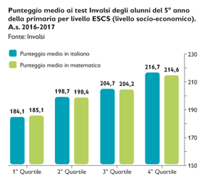 Come nella maggioranza dei Paesi OCSE anche in Italia il tasso di ripetenza è esplicitamente correlato ai risultati scolastici: si calcola che un aumento di 100 punti nei test di matematica sia associato al 56% di riduzione di probabilità di ripetere l’anno. A tale proposito risulta interessante anche il grafico elaborato da Invalsi sui risultati ai test in quinta elementare disaggregati per livello ESCS (che Invalsi calcola in modo simile all’OCSE PISA), che confermano già alla fine della scuola primaria disuguaglianze nelle competenze di base, in italiano e matematica, legate al livello socioeconomico degli alunni, in grado di aumentare i fattori di rischio bocciatura alla scuola secondaria.