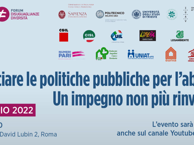 Intrecciato con la proposta, anche il lavoro dell’Osservatorio nazionale sulle politiche abitative e di rigenerazione urbana, percorso collettivo portato avanti dal Forum Disuguaglianze e Diversità insieme a un gruppo di esperti, organizzazioni sindacali, associazioni, operatori e operatrici del settore, studiosi e ricercatori, analisti di politiche della casa che, spinti dalla necessità di affrontare con urgenza, sistematicità e pragmatismo la questione dell’abitare, hanno messo in comune saperi, competenze, punti di vista ed esperienze. Durante l’evento di presentazione dell’Osservatorio è stato presentato un documento per il rilancio delle politiche abitative elaborato in seno all’Osservatorio, basato su una accurata diagnosi delle questioni da affrontare (prima fra tutte la progressiva e perdurante scomparsa della casa dall’agenda politica nazionale) e su una proposta di strategia di medio-lungo periodo, articolata su una pluralità di strumenti e leve, per cogliere la multidimensionalità della povertà abitativa e la sempre più variegata gamma di bisogni che è andata emergendo nelle diverse aree del Paese e nelle differenti fasce di popolazione.