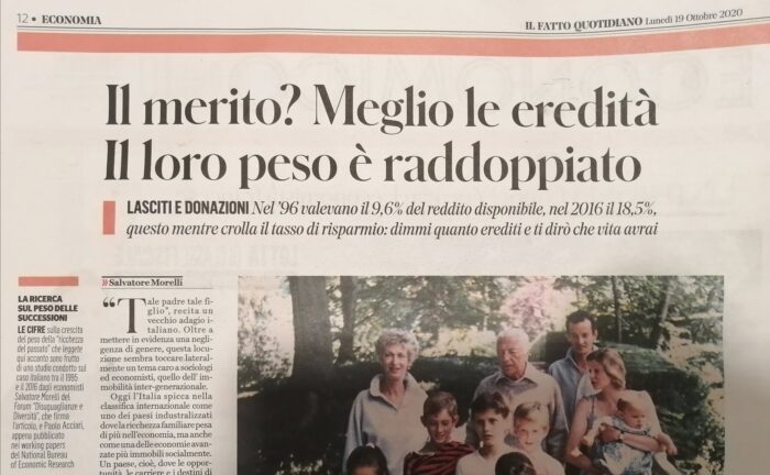 Nel ’96 valevano il 9,6% del reddito disponibile, nel 2016 il 18,5%, questo mentre crolla il tasso di risparmio: dimmi quanto erediti e ti dirò che vita avrai. Un articolo di Salvatore Morelli pubblicato sul Fatto Quotidiano il 19 ottobre 2020