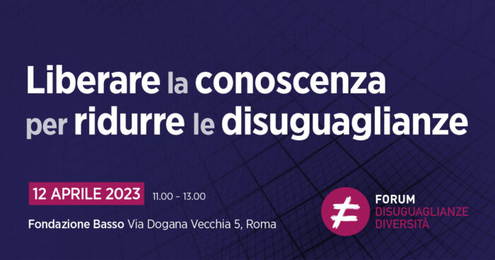 Il Forum Disuguaglianze e Diversità organizza il 12 Aprile dalle ore 11:00 presso la sala conferenze della Fondazione Basso, l’evento “LIBERARE LA CONOSCENZA PER RIDURRE LE DISUGUAGLIANZE” per presentare il Manifesto predisposto da ricercatrici e ricercatori che nel ForumDD si occupano di conoscenza e disuguaglianze, con l’obiettivo di rilanciare le molteplici proposte elaborate negli anni, per orientare le transizioni digitale e tecnologica in senso democratico
