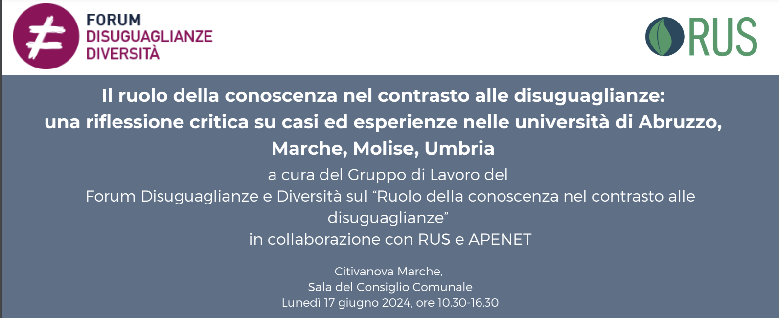 Al fine di promuovere una discussione critica sul ruolo della conoscenza nel contrasto alle disuguaglianze e stimolare un metodo di lavoro basato sulla condivisione di buone pratiche e sulla collaborazione tra atenei, il Gruppo di Lavoro del Forum Disuguaglianze e Diversità sul “Ruolo della conoscenza nel contrasto alle disuguaglianze”, in collaborazione con la Rete delle università per lo sviluppo sostenibile (RUS) e con l’Associazione “Rete italiana degli Atenei ed Enti di Ricerca per il Public Engagement” (APEnet), organizza per lunedì 17 giugno a Civitanova Marche un incontro tra le università di Abruzzo, Marche, Molise e Umbria, con la partecipazione di portatori di interesse a vario titolo coinvolti nei “casi” discussi
